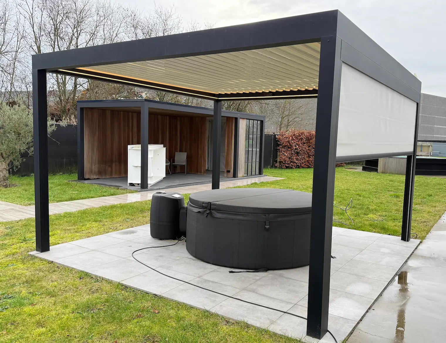Dankzij de dimbare LED-verlichting kun je de pergola ’s avonds omtoveren tot een warm, gezellig lounge- of eetgedeelte — perfect voor diners, BBQ’s of late zomeravonden.